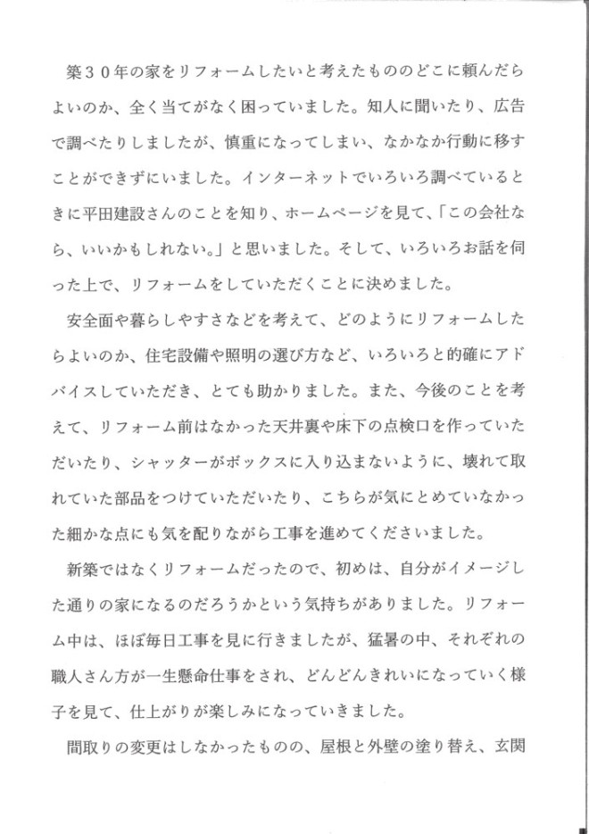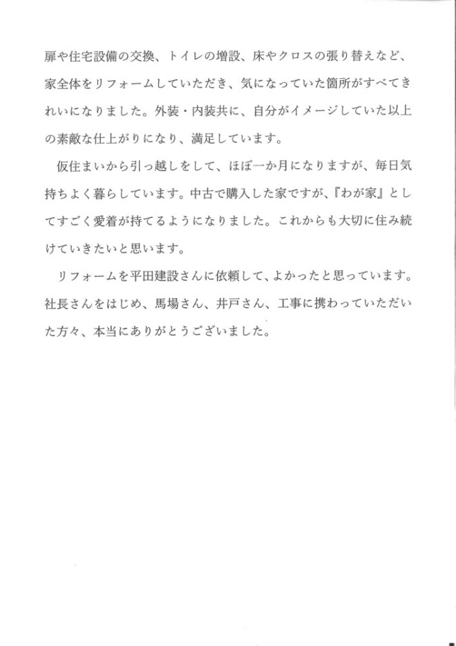 リフォームを平田建設さんに依頼して、よかったと思っています。社長さんをはじめ、馬場さん、井戸さん、工事に携わっていただいた方々、本当にありがとうございました。