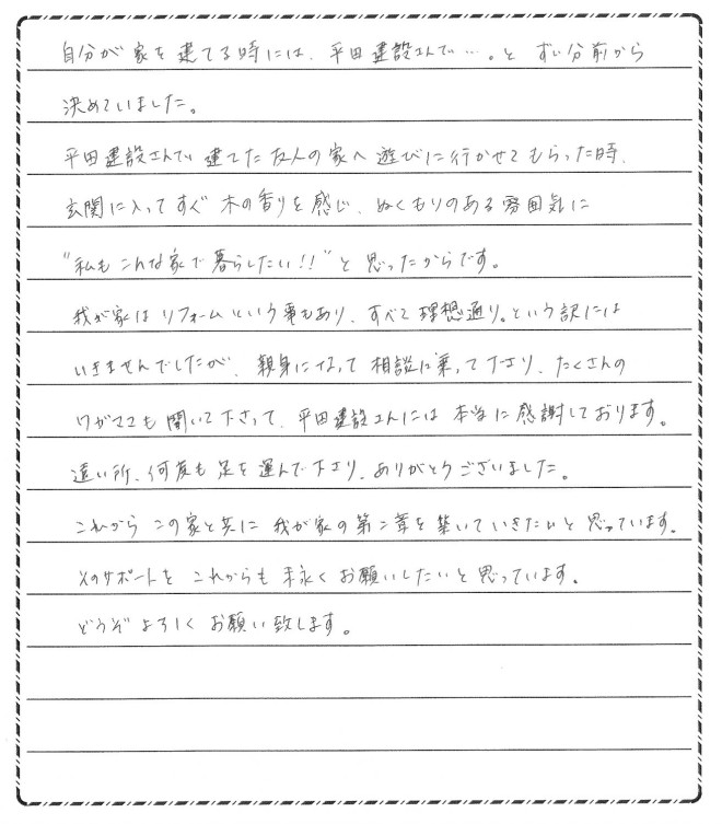 我が家はリフォームという事もあり、すべて理想通り。という訳にはいきませんでしたが、親身になって相談に乗ってくださり、たくさんのワガママも聞いてくださって、平田建設さんには本当に感謝しております。