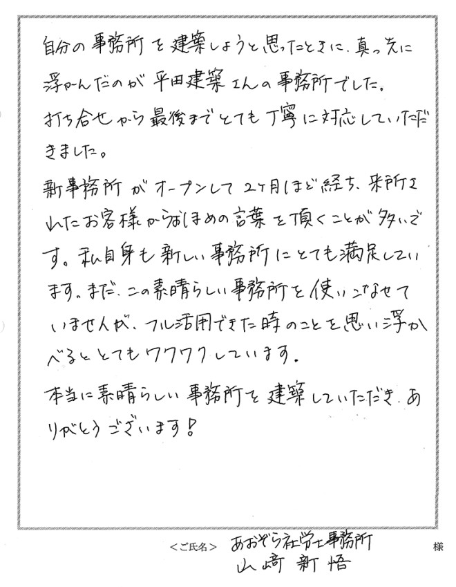 本当に素晴らしい事務所を建築していただき、ありがとうございます!