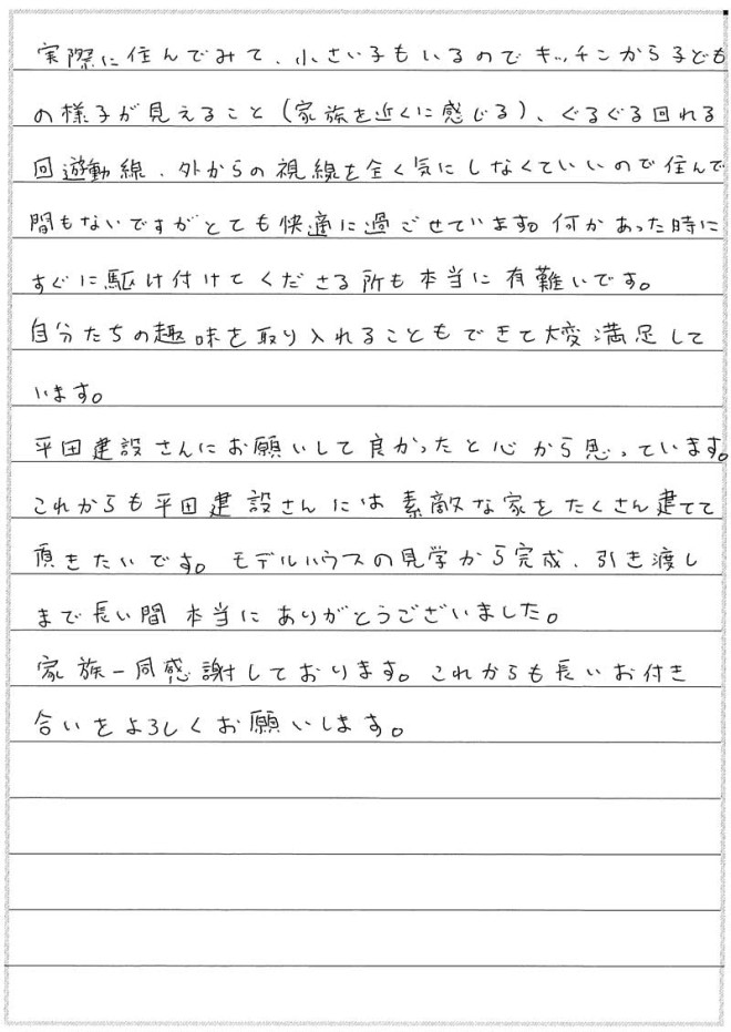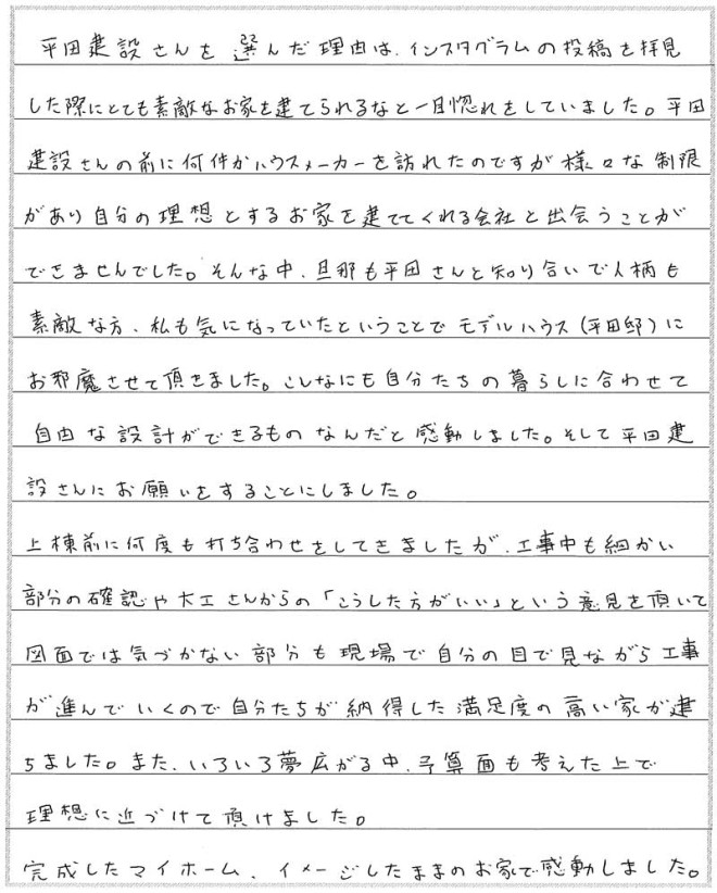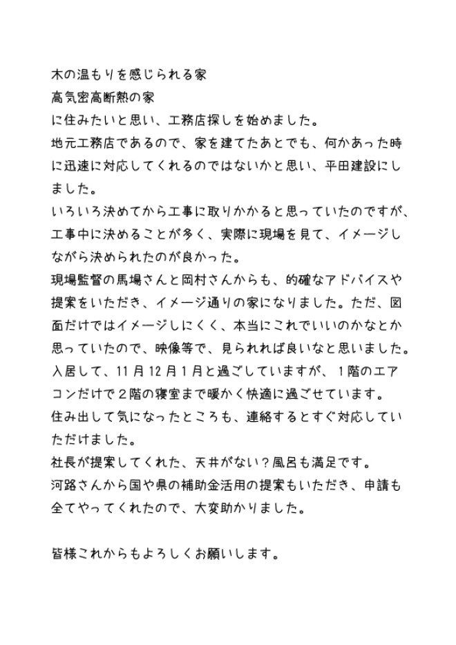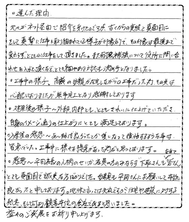 平田社長の人柄のせいか、社員の方のみならず、下職さんも含めて皆さんとても真面目で誠実な方ばかりでした。母親も平田さんにお願いして本当に良かったと申しております。地味といっては失礼ですが、住宅や建築に対する熱意、そして何より顧客本位の会社であると思いました。益々のご発展をお祈り申し上げます。