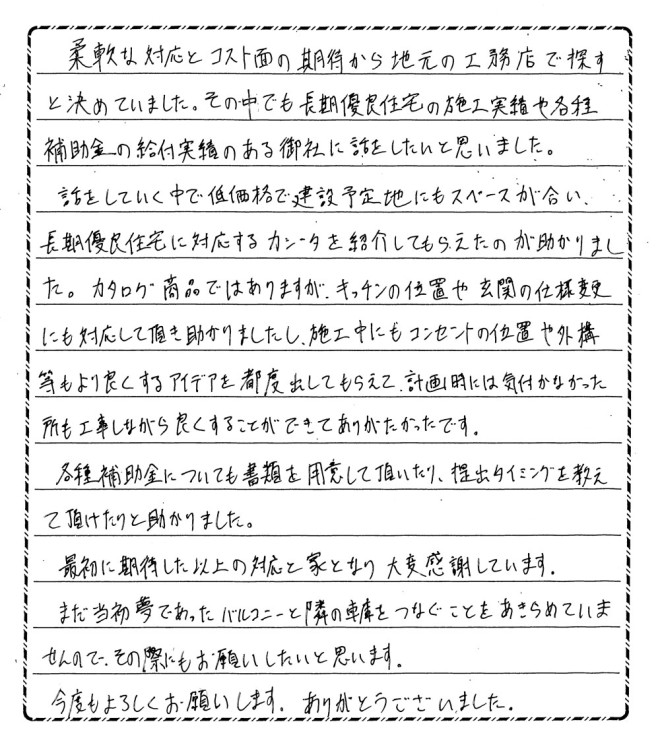 話をしていく中で、低価格で建設予定地にもスペースが合い、長期優良住宅に対応するカシータを照会してもらえたのが助かりました。