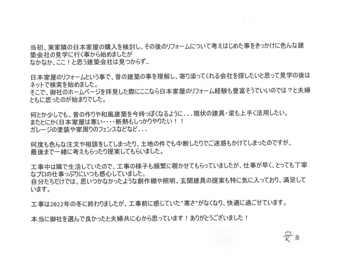 高齢の母親が存在しながらの工事だったため、その点は心配しておりましたが、無事完工となり感謝しております。