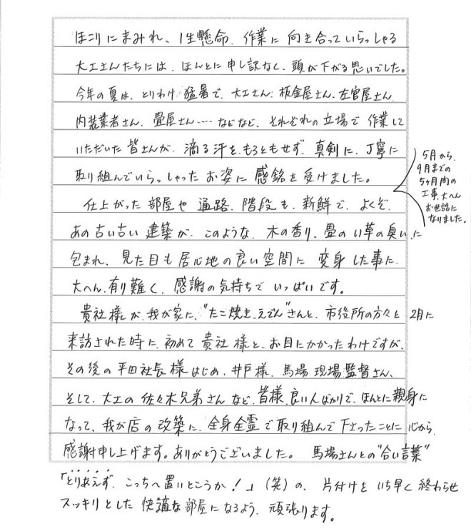 貴社様が我が家に”たこ焼きえでん”さんと、市役所の方々と2月に来訪された時に、初めて貴社様とお目にかかったわけですが、その後の平田社長様をはじめ、井戸様、馬場現場監督さん、そして大工の佐々木兄弟さんなど、皆様良い人ばかりで、ほんとに親身になって我が店の改築に全身全霊で取り組んでくださったことに、心から感謝申し上げます。ありがとうございました。