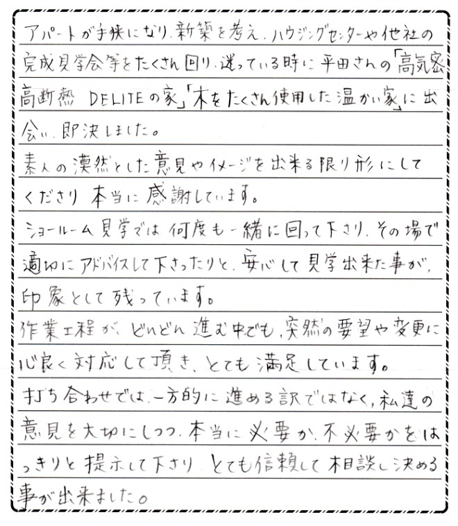 アパートが手狭になり、新築を考え、ハウジングセンターや他社の完成見学会等をたくさん回り、迷っている時に平田さんの「高気密高断熱 DELITEの家」「木をたくさん使用した温かい家」に出会い、即決しました。