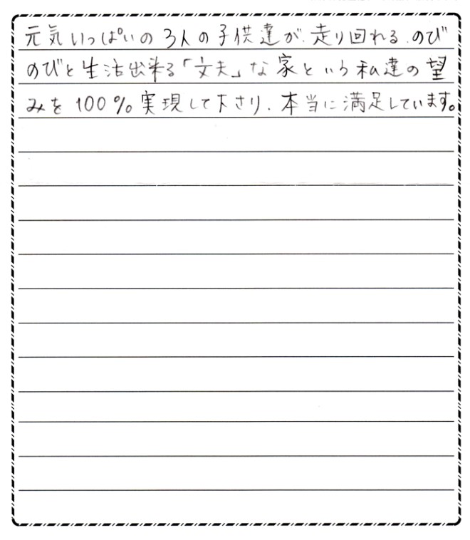 元気いっぱいの3人の子供達が走り回れる、のびのびと生活出来る「丈夫」な家という私達の望みを100%実現して下さり、本当に満足しています。