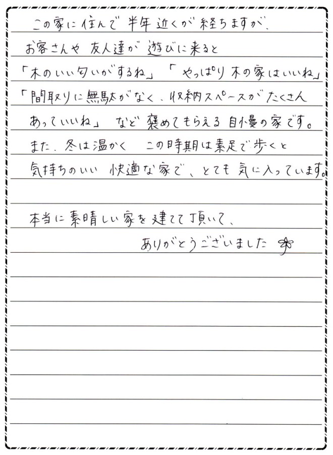 この家に住んで半年近くが経ちますが、お客さんや友人達が遊びに来ると、「木のいい匂いがするね」「やっぱり木の家はいいね」「間取りに無駄がなく、収納スペースがたくさんあっていいね」など、褒めてもらえる自慢の家です。