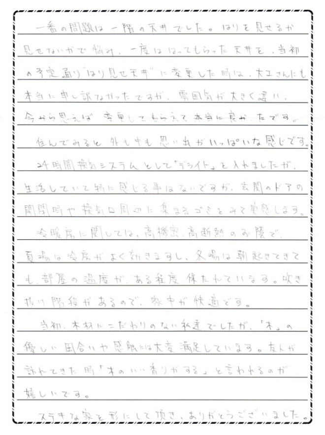 友人が訪れてきた時「木のいい香りがする」と言われるのが嬉しいです。ステキな家を形にして頂き、ありがとうございました。
