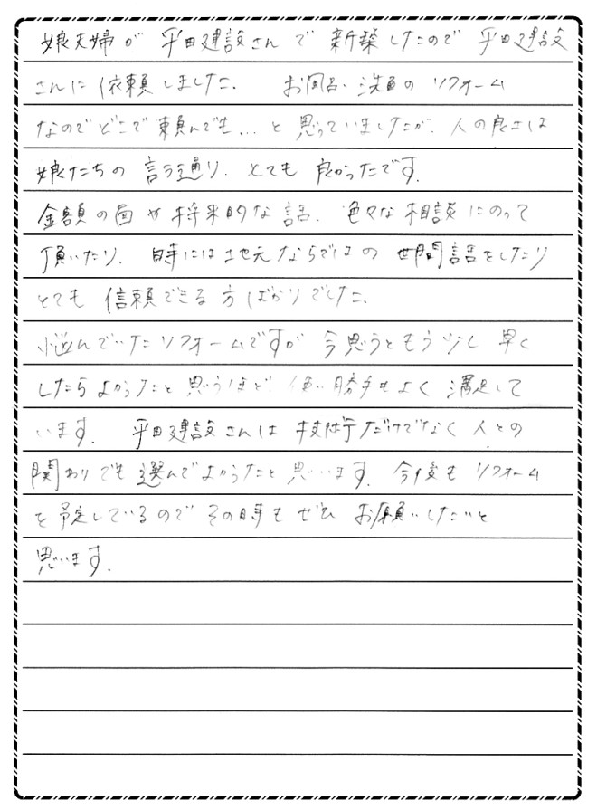 リフォームを平田建設さんに依頼して、よかったと思っています。社長さんをはじめ、馬場さん、井戸さん、工事に携わっていただいた方々、本当にありがとうございました。