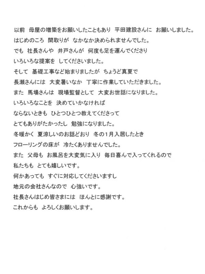 その時も又平田建設様にお願いをしたいと思いますので、これからも家族共々長いお付き合いをよろしくお願いします。