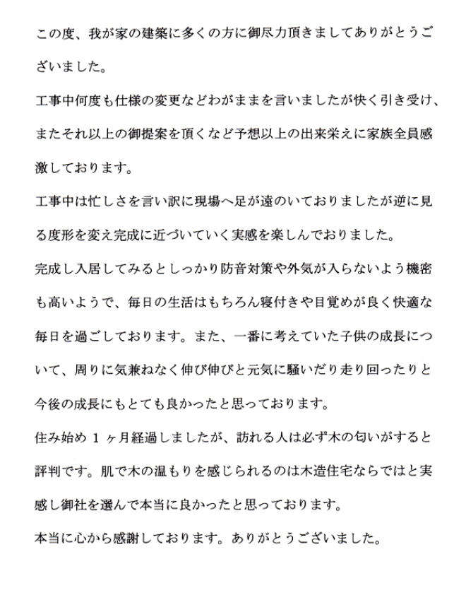 元気いっぱいの3人の子供達が走り回れる、のびのびと生活出来る「丈夫」な家という私達の望みを100%実現して下さり、本当に満足しています。
